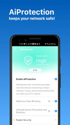ASUS Router App inatoa zana za hali ya juu za usalama na udhibiti wa wazazi ili kulinda familia yako mtandaoni. Weka ratiba za matumizi ya intaneti na zuia maudhui yasiyofaa kwa watoto wako, ukihakikisha mazingira salama ya kidijitali. Dhibiti vifaa vilivyounganishwa kibinafsi kwa urahisi, ukibainisha ni nani anaweza kufikia intaneti, ukiweka vikomo vya bandwidth, na kuwezesha kuvinjari salama kwa kila kifaa. Unaweza hata kubinafsisha aikoni na majina ya vifaa kwa urahisi wa utambulisho. Unda mitandao ya wageni salama na uwashiriki Wi-Fi kwa urahisi kupitia msimbo wa QR, huku ukihakikisha usalama wa mtandao wako mkuu. Usalama wako unahakikishwa zaidi na AiProtection iliyojengewa ndani.